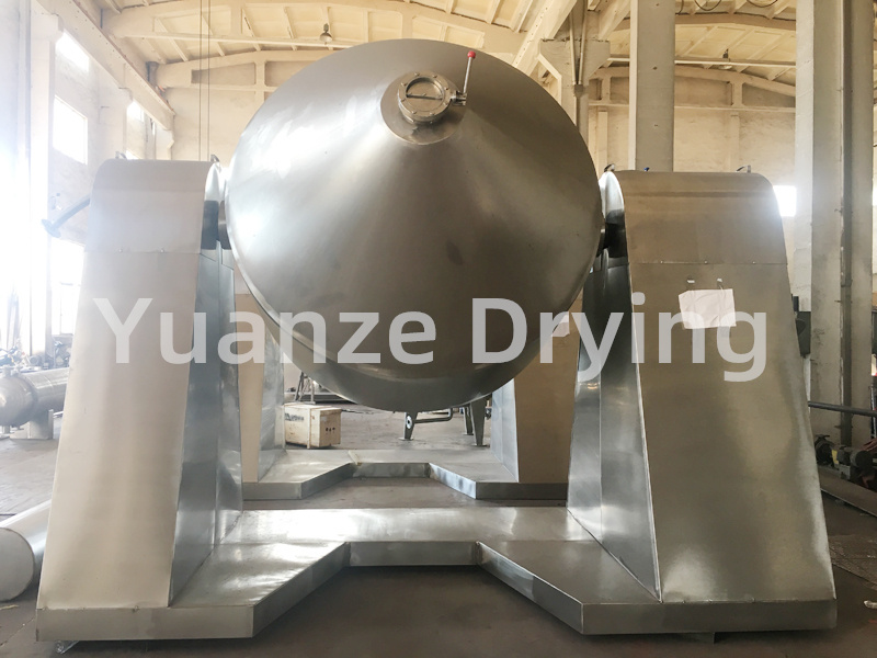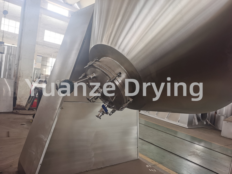 The SZG series double cone rotary vacuum dryer is a double cone rotary tank body. The tank body is in a vacuum state, and thermal oil or hot water is introduced into the jacket for heating. The heat comes into contact with wet materials through the inner wall of the tank body. The water vapor or other gases that evaporate after absorbing heat from wet materials are extracted through a vacuum pump through a vacuum exhaust pipe. Due to the vacuum state inside the tank, and the rotation of the tank causing the material to constantly move up and down, inside and outside, the drying speed of the material is accelerated, the drying rate is increased, and the goal of uniform drying is achieved.
