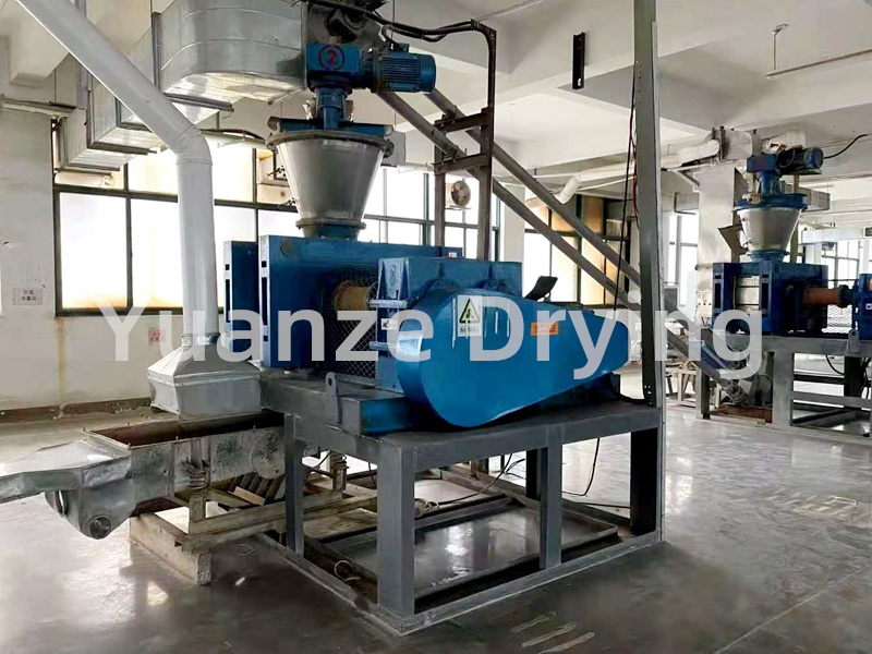 The powdered material is quantitatively fed by a vibrating feeder through a transverse spiral feeder, and uniformly fed into the main material hopper of the rolling mill to maintain a constant amount of material particles. Then, the powder is pre compressed by the longitudinal conical spiral inside the main material hopper of the rolling mill and transported to the arc-shaped grooves of the two pressure rollers. The surfaces of the two pressure rollers are evenly distributed with semi flat circular or diamond grooves of the same shape. Through the meshing transmission of a pair of gears, the two pressure rollers rotate at the same speed and in reverse, The material conveyed by the conical spiral to the groove is bitten into the groove and instantly forced to compress. After compression, the material gradually decreases with the pressure and falls off from the groove under its elasticity and gravity, entering the crushing and granulation system. Then, according to the user's particle size requirements, it is sieved and graded to obtain uniform granular products that meet quality requirements. The screened powder is then returned to the vibrating hopper for recycling.