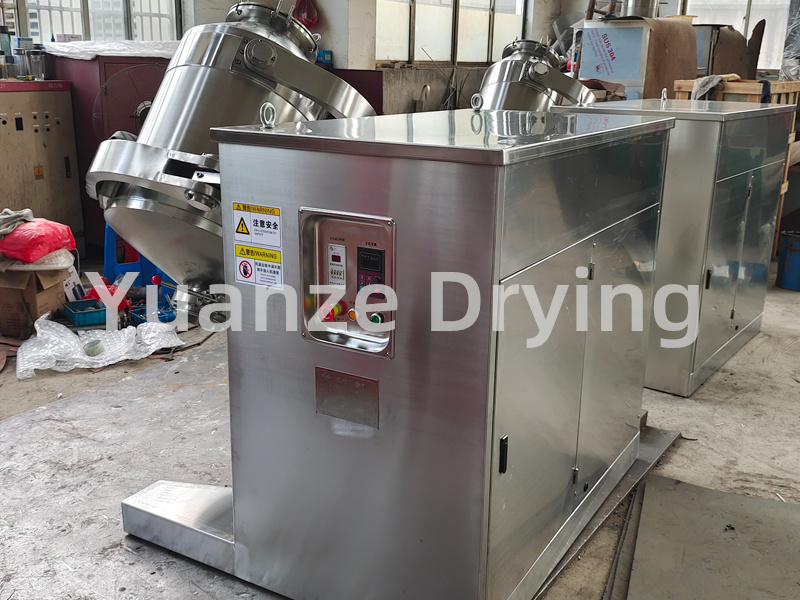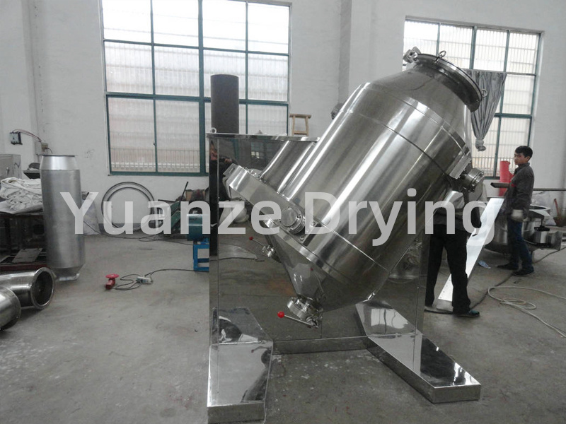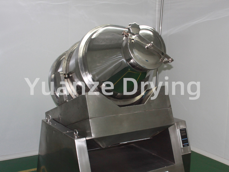 Structure: The machine consists of a base, transmission system, electrical control system, multi-directional motion mechanism, mixing cylinder and other components. The mixing cylinder in direct contact with the material is made of high-quality stainless steel material, and both the inner and outer walls of the barrel are mirror polished.