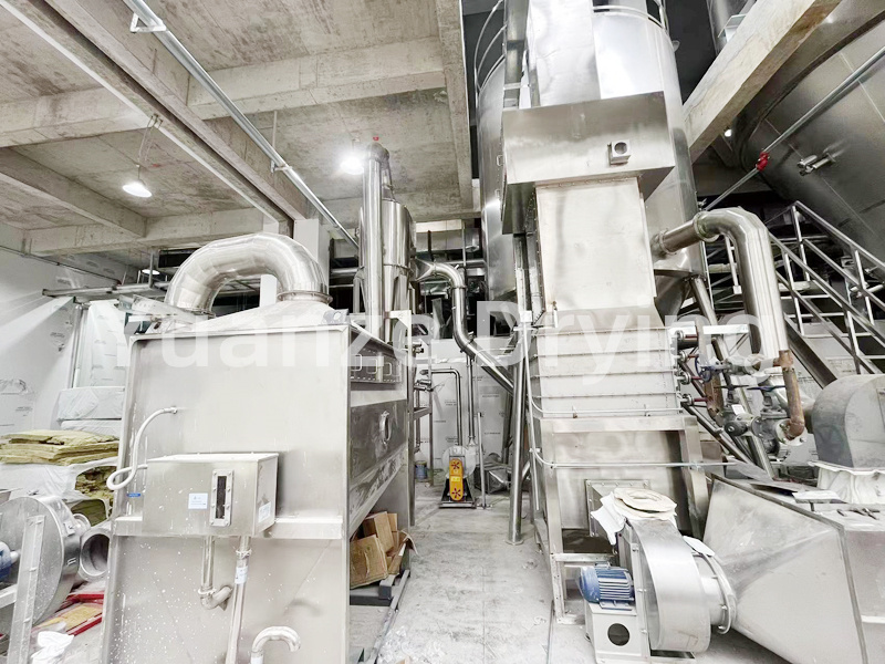 After passing through the air filter, the air enters the air heater. When the air heater reaches the given temperature, it enters the hot air distributor in a tangential direction. The air, after being operated by the hot air distributor, enters the drying chamber uniformly and spirally. At the same time, the material liquid is atomized into 20-60um droplets by the atomizer. When the droplets come into contact with the hot air, they quickly vaporize and dry into powder or particulate products. The cyclone air separator is used to directly collect the waste gas, which is then pneumatically transported to the material bin to complete the cooling and transportation of the material. The waste gas is discharged from the fan outlet through the water mist dust collector.