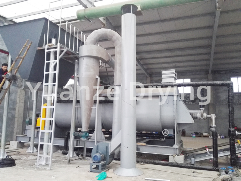 The sludge enters the guide plate inside the dryer through the chute of the feeding machine. As the cylinder rotates, the sludge is guided to the inclined lifting plate and lifted to the center position of the cylinder, gradually sprinkling to form a material curtain. High temperature airflow passes through it, causing the sludge to preheat and evaporate some moisture. When the sludge falls and moves onto the active grate wing, the material is mixed with the preheated grate wing, transferring heat to the material and causing some moisture to evaporate. At the same time, the material carried by the wing plate is lifted and sprinkled multiple times, and the material undergoes convection and contact heat exchange with the hot air flow. At the same time, the cleaning device buried in the material also slides down the inner side of the arc-shaped lifting plate to remove the material adhered to the inner wall of the lifting plate. After the cleaning device rotates along the vertical line of the cylinder, it is then dragged on the back of the circular arc lifting plate to remove the material adhered to the outer wall of the lifting plate. With the continuous rotation of the cylinder, some water evaporates and the sludge is further dried. At the same time, the cleaning device also plays a crushing role in the sludge ball, improving the drying speed. After the sludge is dried, it becomes a loose material with low moisture content and is discharged from the discharge port.
