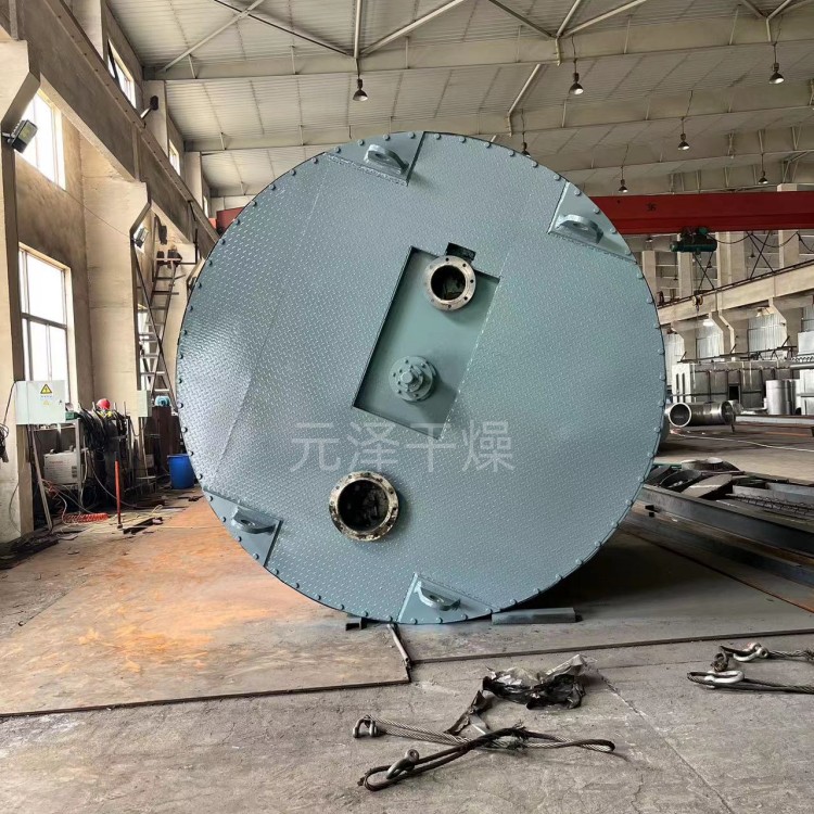 湿物料自加料器连续地加到干燥器上部第一层干燥盘上,带有耙叶的耙臂作回转运动使耙臂作回转运动使耙叶连续地翻抄物料。物料沿指数螺旋线流过干燥盘表面,在小干燥盘上的物料被移送到外缘,并在外缘落到下方的大干燥盘外缘,在大干盘上物料向里移动并从中间落料口落如下一层小干燥盘中。大小干燥盘上下交替排列,物料得以连续地流过整个干燥器。中空的干燥盘内通入加热介质,加热介质形式有饱和蒸汽、热水、导热油和高温熔盐,加热介质由干燥盘的一端进入,从另一端导出。已干物料从最后一层干燥盘落到壳体的底层,最后被耙叶移送到出料口排出。湿份从物料中溢出,由设在顶盖上的排湿口排出,真空型盘式干燥器的湿气由设在顶盖上的真空泵口排出。从底层排出的干物料可直接包装。通过配加翅片加热器、溶剂回收冷凝器、袋式除尘器、干料返混机构、引风机等辅机,可提高其干燥的生产能力,干燥膏糊状和热敏性物料,可方便地回收溶剂,并能进行热解和反应操作。