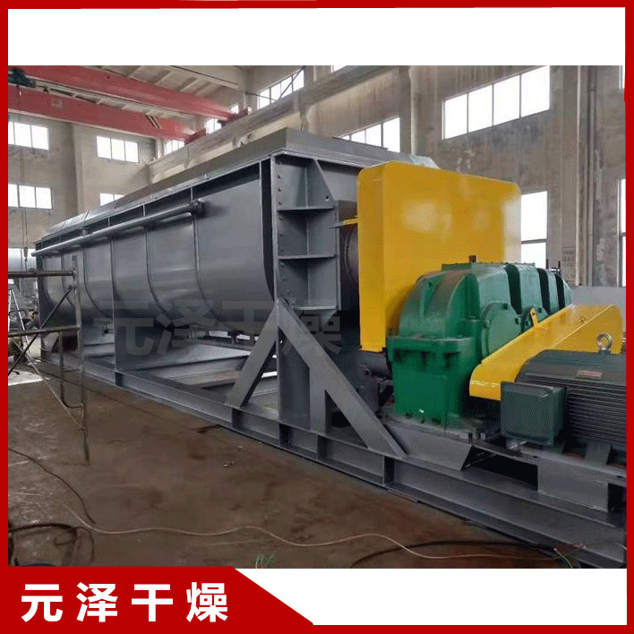 空心轴上密集排列着楔型中空浆叶,热介质经空心轴流经浆叶。单位有效容积内传热面积很大,热介质温度从-40℃到320℃,可以是水蒸汽,也可以是液体型:如热水、导热油等。间接传导加热,没有携带空气带走热量,热量均用来加热物料。热量损失仅为通过器体保温层向环境的散热。楔型浆叶传热面具有自清洁功能。物料颗粒与楔型面的相对运动产生洗刷作用,能够洗刷掉楔型面上附着物料,使运转中一直保持着清洁的传热面。浆叶干燥机的壳体为Ω型,壳体内一般安排二到四根空心搅拌轴。壳体有密封端盖与上盖,防止物料粉尘外泄而充分发挥作用。