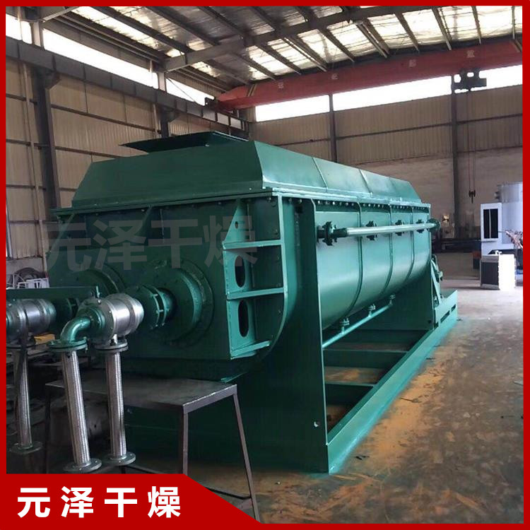 空心轴上密集排列着楔型中空浆叶,热介质经空心轴流经浆叶。单位有效容积内传热面积很大,热介质温度从-40℃到320℃,可以是水蒸汽,也可以是液体型:如热水、导热油等。间接传导加热,没有携带空气带走热量,热量均用来加热物料。热量损失仅为通过器体保温层向环境的散热。楔型浆叶传热面具有自清洁功能。物料颗粒与楔型面的相对运动产生洗刷作用,能够洗刷掉楔型面上附着物料,使运转中一直保持着清洁的传热面。浆叶干燥机的壳体为Ω型,壳体内一般安排二到四根空心搅拌轴。壳体有密封端盖与上盖,防止物料粉尘外泄而充分发挥作用。