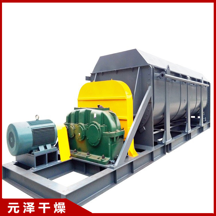 空心轴上密集排列着楔型中空浆叶,热介质经空心轴流经浆叶。单位有效容积内传热面积很大,热介质温度从-40℃到320℃,可以是水蒸汽,也可以是液体型:如热水、导热油等。间接传导加热,没有携带空气带走热量,热量均用来加热物料。热量损失仅为通过器体保温层向环境的散热。楔型浆叶传热面具有自清洁功能。物料颗粒与楔型面的相对运动产生洗刷作用,能够洗刷掉楔型面上附着物料,使运转中一直保持着清洁的传热面。浆叶干燥机的壳体为Ω型,壳体内一般安排二到四根空心搅拌轴。壳体有密封端盖与上盖,防止物料粉尘外泄而充分发挥作用。