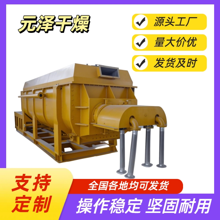 空心轴上密集排列着楔型中空浆叶,热介质经空心轴流经浆叶。单位有效容积内传热面积很大,热介质温度从-40℃到320℃,可以是水蒸汽,也可以是液体型:如热水、导热油等。间接传导加热,没有携带空气带走热量,热量均用来加热物料。热量损失仅为通过器体保温层向环境的散热。楔型浆叶传热面具有自清洁功能。物料颗粒与楔型面的相对运动产生洗刷作用,能够洗刷掉楔型面上附着物料,使运转中一直保持着清洁的传热面。浆叶干燥机的壳体为Ω型,壳体内一般安排二到四根空心搅拌轴。壳体有密封端盖与上盖,防止物料粉尘外泄而充分发挥作用。