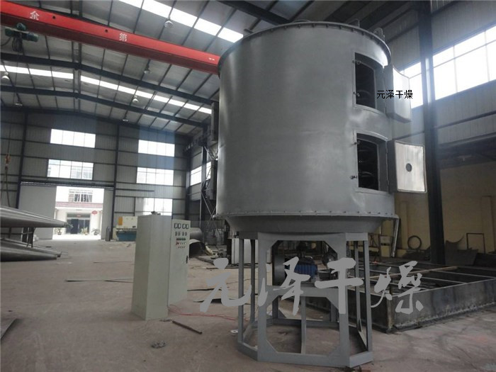湿物料自加料器连续地加到干燥器上部层干燥盘上,带有耙叶的耙臂作回转运动使耙臂作回转运动使耙叶连续地翻抄物料。物料沿指数螺旋线流过干燥盘表面,在小干燥盘上的物料被移送到外缘,并在外缘落到下方的大干燥盘外缘,在大干盘上物料向里移动并从中间落料口落如下一层小干燥盘中。大小干燥盘上下交替排列,物料得以连续地流过整个干燥器。中空的干燥盘内通入加热介质,加热介质形式有饱和蒸汽、热水和导热油,加热介质由干燥盘的一端进入,从另一端导出。已干物料从后一层干燥盘落到壳体的底层,后被耙叶移送到出料口排出。湿份从物料中逸出,由设在顶盖上的排湿口排出,真空型盘式干燥器的湿气由设在顶盖上的真空泵口排出。从底层排出的干物料可直接包装。通过配加翅片加热器、溶剂回收冷凝器、袋式除尘器、干料返混机构、引风机等辅机,可提高其干燥的生产能力,干燥膏糊状和热敏性物 料,可方便地回收溶剂,并能进行热解和反应操作。