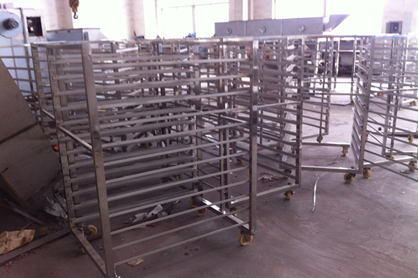 3、布置:每层放2只烘盘,共12层,常规烘车层间距100mm,也可根据烘箱的尺寸定做层间距和层数。