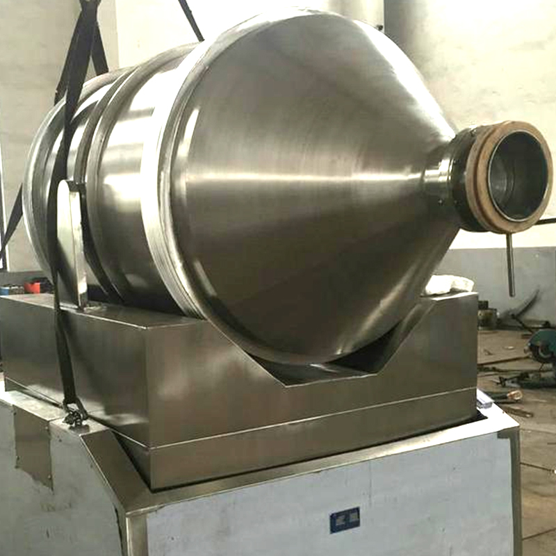 二维混合机,全称二维运动混合机,顾名思义,是指转筒可同时进行二个方向运动的混合机。二个运动方向分别是转筒的转动,转筒随摆动架的摆动。被混和物料在转筒内随转筒转动、翻转、混和的同时又随转筒的摆动而发生左右来回的掺混运动,在这两个运动的共同作用下,物料在短时间内得到充分的混和