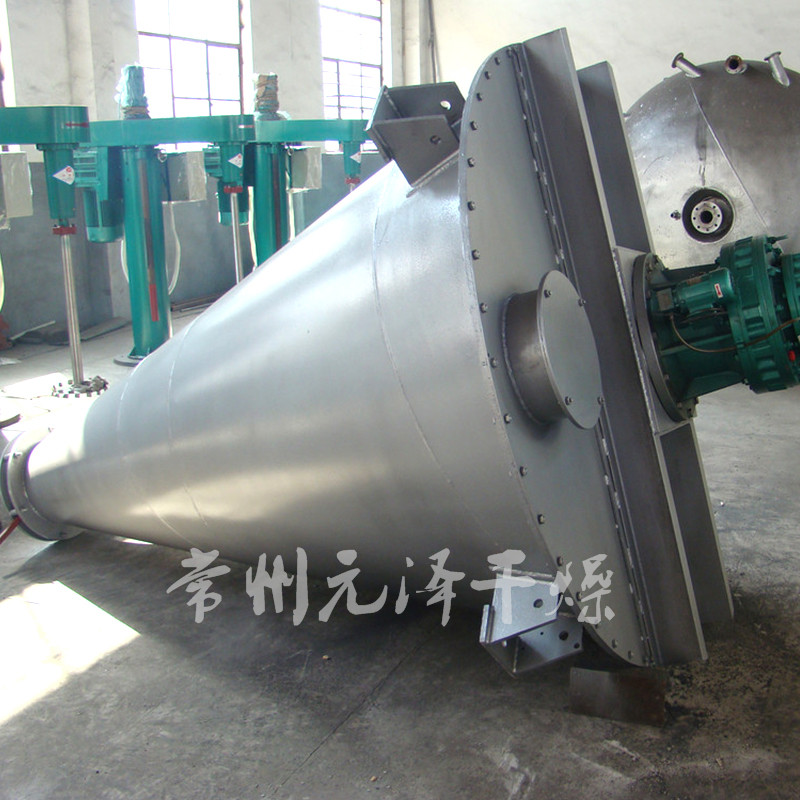 该设备主体立式静止,内部加热的螺带进行圆周搅拌提升运动,物料进入干燥腔体后利用夹套和搅拌螺带对物料接触加热,物料被螺带有序的搅动,翻转、提升、瀑落,使物料不断的与加热腔壁接触而进行强制热交换,受热挥发的溶媒在真空状态下被抽走,从而达到快速干燥的目的。