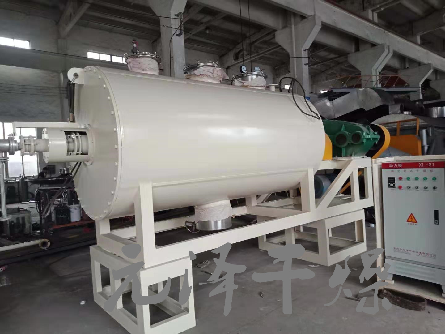 主要结构为带夹套的卧式圆筒容器,装有低速搅拌轴,轴上装有按一定方向排列的耙齿。搅拌轴有两种形式,一种为不加热的耙齿轴,另一种为可通入热介质的中空耙齿轴。夹套内通入加热介质(热水、热油)。筒体内加入定量的湿物料,耙齿轴对物料进行搅拌,使物料加热均匀,耙齿轴在时间继电器的控制下,按一定时间间隔要求按正转-停止-反转-停止-正转运行,运行周期由用户根据物料的工艺操作条件来设定。筒体中被干燥的物料在耙齿轴有规律的搅拌下,周而复始,直至物料被干燥到工艺要求。内筒体上部安置有真空接口,接入真空系统,使被干燥物料在负压下加热干燥,可保证干燥物料在低温下加热,不致破坏物料的物化性质。物料达到干燥要求后,打开筒体下部的放料阀,让物料在耙齿轴的搅拌下向中间移动进行出料。