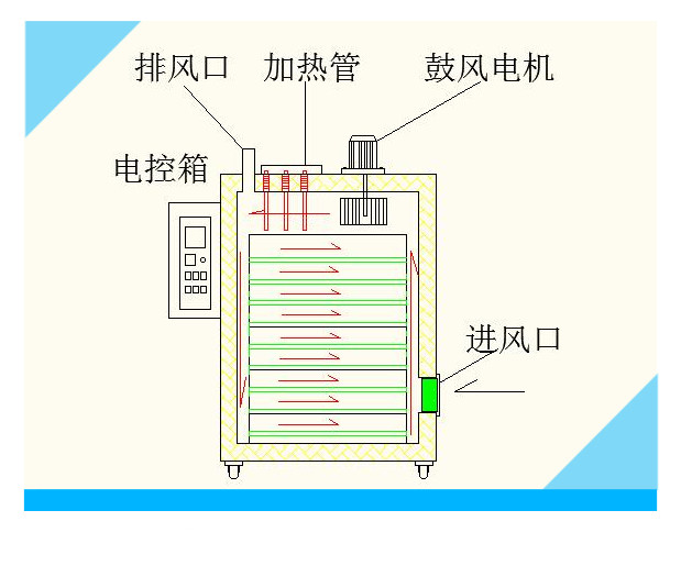 立龙热风循环烘箱原理:在设备的两侧及箱顶带有热风循环风道,从炉内两侧均匀水平送风,箱内温度均匀。