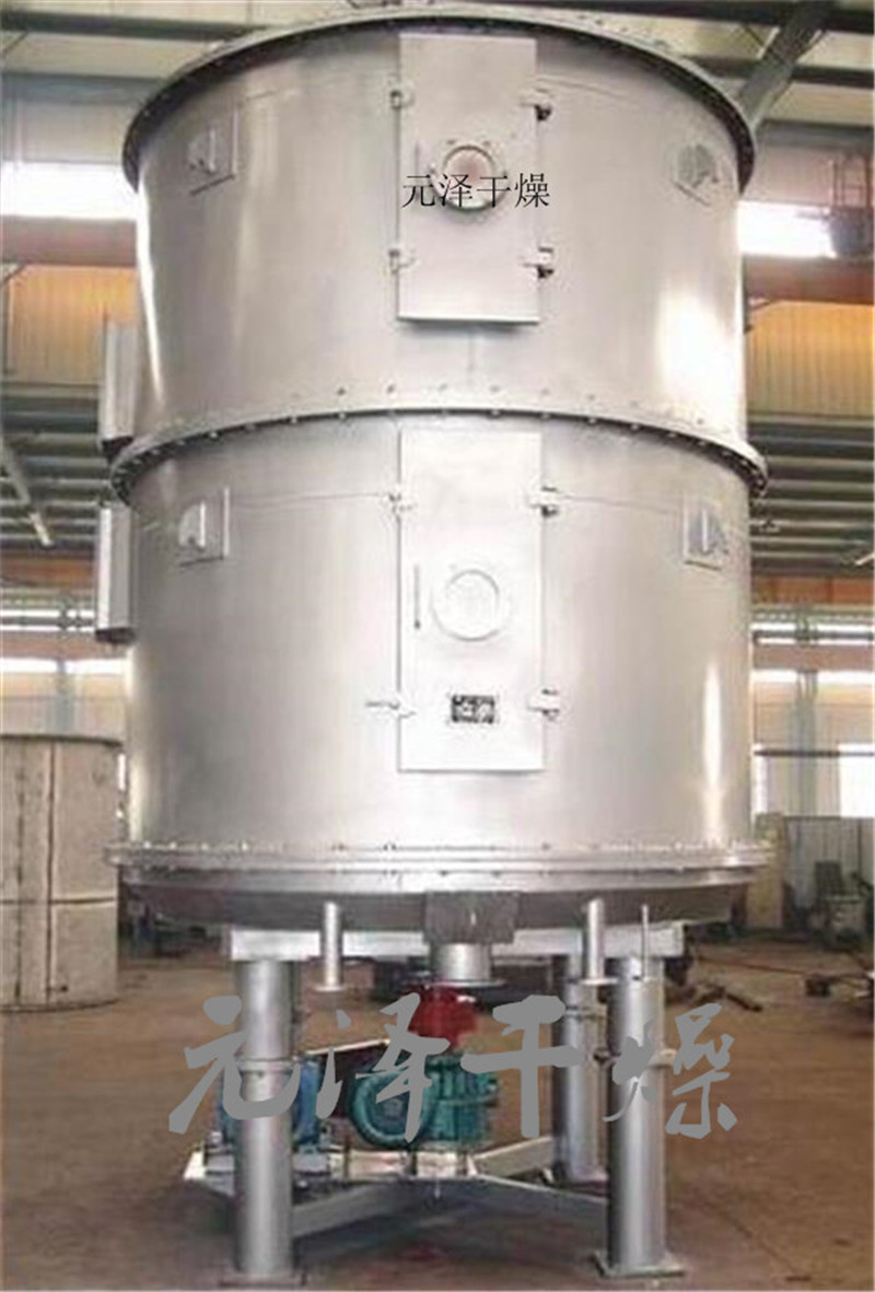 盘式离心干燥机由湿物料自加料器连续地加到干燥器上部层干燥盘上,带有耙叶的耙臂作回转运动使耙臂作回转运动使耙叶连续地翻抄物料。物料沿指数螺旋线流过干燥盘表面,在小干燥盘上的物料被移送到外缘,并在外缘落到下方的大干燥盘外缘,在大干盘上物料向里移动并从中间落料口落如下一层小干燥盘中。大小干燥盘上下交替排列,物料得以连续地流过整个干燥器。中空的干燥盘内通入加热介质,加热介质形式有饱和蒸汽、热水和导热油,加热介质由干燥盘的一端进入,从另一端导出。已干物料从后一层干燥盘落到壳体的底层,后被耙叶移送到出料口排出。湿份从物料中逸出,由设在顶盖上的排湿口排出,真空型盘式干燥器的湿气由设在顶盖上的真空泵口排出。从底层排出的干物料可直接包装。通过配加翅片加热器、溶剂回收冷凝器、袋式除尘器、干料返混机构、引风机等辅机,可提高其干燥的生产能力,干燥膏糊状和热敏性物 料,可方便地回收溶剂,并能进行热解和反应操作。