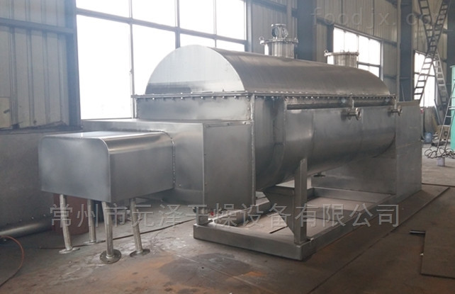 空心轴上密集排列着楔型中空浆叶,热介质经空心轴流经浆叶。单位有效容积内传热面积很大,热介质温度从-40℃到320℃,可以是水蒸汽,也可以是液体型:如热水、导热油等。间接传导加热,没有携带空气带走热量,热量均用来加热物料。热量损失仅为通过器体保温层向环境的散热。楔型浆叶传热面具有自清洁功能。物料颗粒与楔型面的相对运动产生洗刷作用,能够洗刷掉楔型面上附着物料,使运转中一直保持着清洁的传热面。浆叶干燥机的壳体为Ω型,壳体内一般安排二到四根空心搅拌轴。壳体有密封端盖与上盖,防止物料粉尘外泄而充分发挥作用。