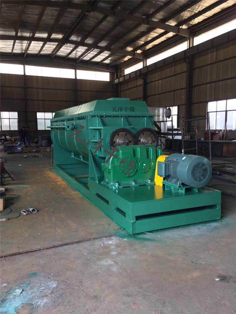 空心轴上密集排列着楔型中空浆叶,热介质经空心轴流经浆叶。单位有效容积内传热面积很大,热介质温度从-40℃到320℃,可以是水蒸汽,也可以是液体型:如热水、导热油等。间接传导加热,没有携带空气带走热量,热量均用来加热物料。热量损失仅为通过器体保温层向环境的散热。楔型浆叶传热面具有自清洁功能。物料颗粒与楔型面的相对运动产生洗刷作用,能够洗刷掉楔型面上附着物料,使运转中一直保持着清洁的传热面。浆叶干燥机的壳体为Ω型,壳体内一般安排二到四根空心搅拌轴。壳体有密封端盖与上盖,防止物料粉尘外泄而充分发挥作用。