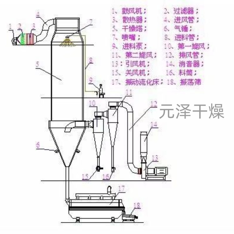 1、干燥速度快,料液经雾化后表面积大大增加,在热风气流中,瞬间就可蒸发95-98%的水份,完成干燥的时间仅需十几秒到数十秒,特别适用于热敏性物料的干燥。