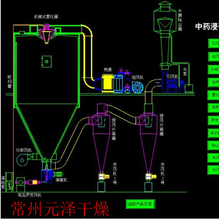 喷雾干燥机为开式循环,并流式,离心式雾化。干燥介质空气经过初、中效空气过滤器过滤后根据操作指令由鼓风机吸取再经加热器加热通过高效过滤器的热风分配器进入喷雾干燥主塔。液体物料根据操作指令经过蠕动泵,进入高速旋转的离心喷头,在离心力作用下被分散成小雾滴。在喷雾干燥主塔内,小雾滴与热风在充分接触,沿其特定路径进行热交换后被干燥成为产品,然后通过旋风分离器实现分离,固体物料被收集,气体介质再经过过滤后被排出。整套喷雾系统易清洁,符合GMP要求。