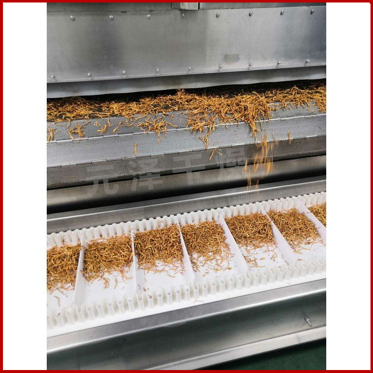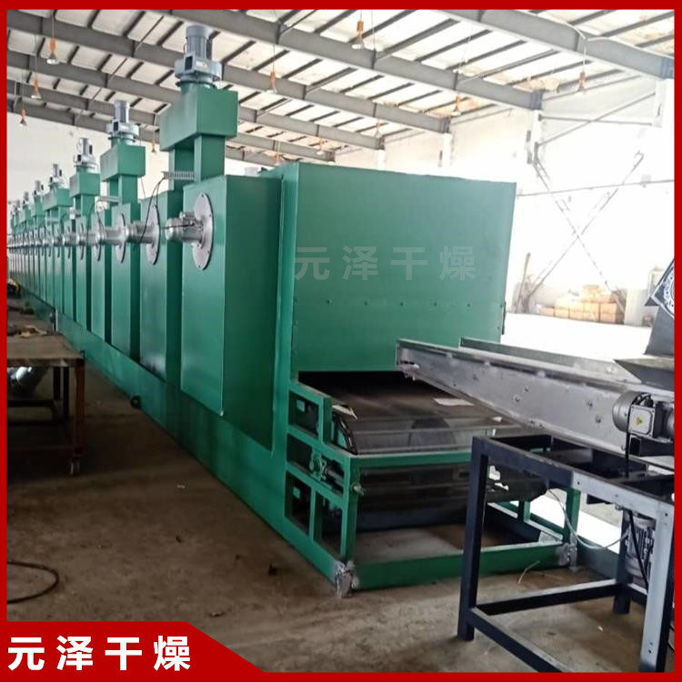 物料由加料器均匀地铺在 12-60 目不锈钢丝网上,由传动装置拖动在干燥机内移动。干燥机由若干单元组成,每一单元热风独立循环,部分尾气由专门排湿风机排出,废气由调节阀控制,热气由下往上或由上往下穿过物料,加热干燥并带走水分。网带运行速度可根据物料温度自由调节,干燥后的成品连续落入收料器中。