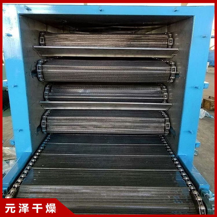 物料由加料器均匀地铺在网带上,网带一般采用12-60目不锈钢丝网,由传动装置拖动在干燥机内移动。干燥机由若干单元组成,每一单元热风独立循环,部分尾气由专门排湿风机排出,废气由调节阀控制,热气由下往上或由上往下穿过铺满物料的网带完成热量与质量传递的进程,带走物料水份。网带缓慢移动,运行速度可根据物料温度自由调节,干燥后的成品连续落入收料器中。上下循环单元根据用户需要可灵活配备,单元数量亦可根据需要选取。