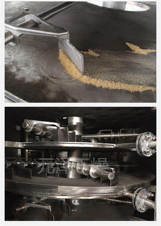 湿物料自加料器连续地加到干燥器上部层干燥盘上,带有耙叶的耙臂作回转运动使耙臂作回转运动使耙叶连续地翻抄物料。物料沿指数螺旋线流过干燥盘表面,在小干燥盘上的物料被移送到外缘,并在外缘落到下方的大干燥盘外缘,在大干盘上物料向里移动并从中间落料口落如下一层小干燥盘中。大小干燥盘上下交替排列,物料得以连续地流过整个干燥器。中空的干燥盘内通入加热介质,加热介质形式有饱和蒸汽、热水和导热油,加热介质由干燥盘的一端进入,从另一端导出。已干物料从后一层干燥盘落到壳体的底层,后被耙叶移送到出料口排出。湿份从物料中逸出,由设在顶盖上的排湿口排出,真空型盘式干燥器的湿气由设在顶盖上的真空泵口排出。从底层排出的干物料可直接包装。通过配加翅片加热器、溶剂回收冷凝器、袋式除尘器、干料返混机构、引风机等辅机,可提高其干燥的生产能力,干燥膏糊状和热敏性物 料,可方便地回收溶剂,并能进行热解和反应操作。