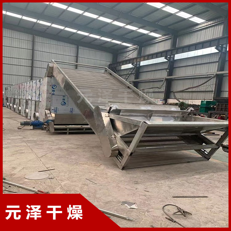 物料由加料器均匀地铺在网带上,网带一般采用12-60目不锈钢丝网,由传动装置拖动在干燥机内移动。干燥机由若干单元组成,每一单元热风独立循环,部分尾气由专门排湿风机排出,废气由调节阀控制,热气由下往上或由上往下穿过铺满物料的网带完成热量与质量传递的进程,带走物料水份。网带缓慢移动,运行速度可根据物料温度自由调节,干燥后的成品连续落入收料器中。上下循环单元根据用户需要可灵活配备,单元数量亦可根据需要选取。