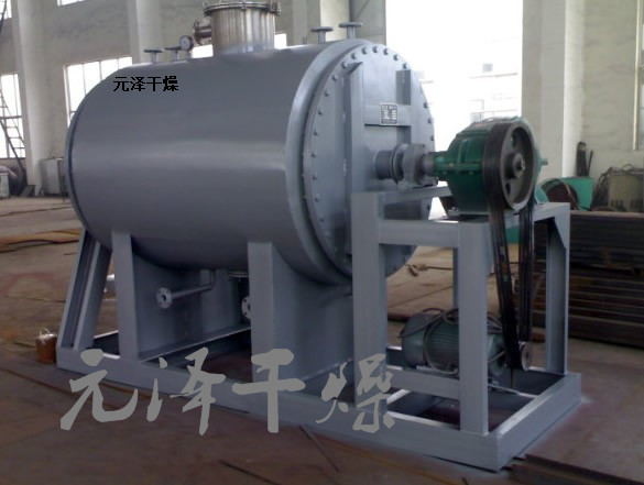 主要结构为带夹套的卧式圆筒容器,装有低速搅拌轴,轴上装有按一定方向排列的耙齿。搅拌轴有两种形式,一种为不加热的耙齿轴,另一种为可通入热介质的中空耙齿轴。夹套内通入加热介质(热水、热油)。筒体内加入定量的湿物料,耙齿轴对物料进行搅拌,使物料加热均匀,耙齿轴在时间继电器的控制下,按一定时间间隔要求按正转-停止-反转-停止-正转运行,运行周期由用户根据物料的工艺操作条件来设定。筒体中被干燥的物料在耙齿轴有规律的搅拌下,周而复始,直至物料被干燥到工艺要求。内筒体上部安置有真空接口,接入真空系统,使被干燥物料在负压下加热干燥,可保证干燥物料在低温下加热,不致破坏物料的物化性质。物料达到干燥要求后,打开筒体下部的放料阀,让物料在耙齿轴的搅拌下向中间移动进行出料。