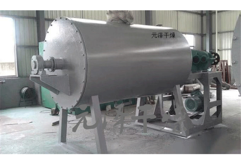 主要结构为带夹套的卧式圆筒容器,装有低速搅拌轴,轴上装有按一定方向排列的耙齿。搅拌轴有两种形式,一种为不加热的耙齿轴,另一种为可通入热介质的中空耙齿轴。夹套内通入加热介质(热水、热油)。筒体内加入定量的湿物料,耙齿轴对物料进行搅拌,使物料加热均匀,耙齿轴在时间继电器的控制下,按一定时间间隔要求按正转-停止-反转-停止-正转运行,运行周期由用户根据物料的工艺操作条件来设定。筒体中被干燥的物料在耙齿轴有规律的搅拌下,周而复始,直至物料被干燥到工艺要求。内筒体上部安置有真空接口,接入真空系统,使被干燥物料在负压下加热干燥,可保证干燥物料在低温下加热,不致破坏物料的物化性质。物料达到干燥要求后,打开筒体下部的放料阀,让物料在耙齿轴的搅拌下向中间移动进行出料。