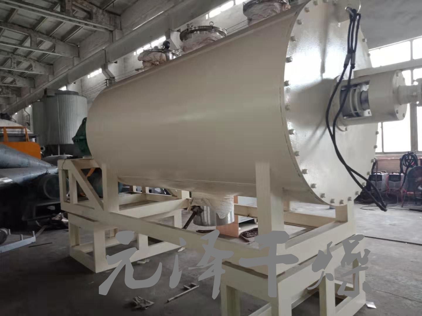 主要结构为带夹套的卧式圆筒容器,装有低速搅拌轴,轴上装有按一定方向排列的耙齿。搅拌轴有两种形式,一种为不加热的耙齿轴,另一种为可通入热介质的中空耙齿轴。夹套内通入加热介质(热水、热油)。筒体内加入定量的湿物料,耙齿轴对物料进行搅拌,使物料加热均匀,耙齿轴在时间继电器的控制下,按一定时间间隔要求按正转-停止-反转-停止-正转运行,运行周期由用户根据物料的工艺操作条件来设定。筒体中被干燥的物料在耙齿轴有规律的搅拌下,周而复始,直至物料被干燥到工艺要求。内筒体上部安置有真空接口,接入真空系统,使被干燥物料在负压下加热干燥,可保证干燥物料在低温下加热,不致破坏物料的物化性质。物料达到干燥要求后,打开筒体下部的放料阀,让物料在耙齿轴的搅拌下向中间移动进行出料。
