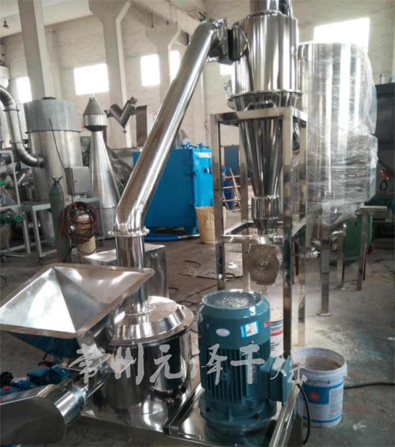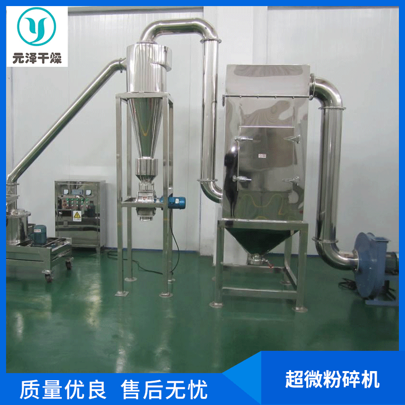 超微粉碎机是利用空气分离、重压研磨、剪切的形式来实现干性物料超微粉碎的设备。它由柱形粉碎室、研磨轮、研磨轨、风机、物料收集系统等组成。物料通过投料口进入柱形粉碎室,被沿着研磨轨做圆周运动的研磨轮碾压、剪切而实现粉碎。被粉碎的物料通过风机引起的负压气流带出粉碎室,进入物料收集系统,经过滤袋过滤,空气被排出,物料、粉尘被收集,完成粉碎。物料由料门经螺旋输送器进入粉碎室,被高速旋转的刀片剪切粉碎,通过负压风运的方法把物料运入旋风分离器,袋式除尘器、排出物料粉尘由吸尘箱经布袋过滤回收,生产过程中无粉尘飞扬,且能提高物料的利用率,降低企业成本。