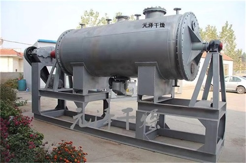 主要结构为带夹套的卧式圆筒容器,装有低速搅拌轴,轴上装有按一定方向排列的耙齿。搅拌轴有两种形式,一种为不加热的耙齿轴,另一种为可通入热介质的中空耙齿轴。夹套内通入加热介质(热水、热油)。筒体内加入定量的湿物料,耙齿轴对物料进行搅拌,使物料加热均匀,耙齿轴在时间继电器的控制下,按一定时间间隔要求按正转-停止-反转-停止-正转运行,运行周期由用户根据物料的工艺操作条件来设定。筒体中被干燥的物料在耙齿轴有规律的搅拌下,周而复始,直至物料被干燥到工艺要求。内筒体上部安置有真空接口,接入真空系统,使被干燥物料在负压下加热干燥,可保证干燥物料在低温下加热,不致破坏物料的物化性质。物料达到干燥要求后,打开筒体下部的放料阀,让物料在耙齿轴的搅拌下向中间移动进行出料。