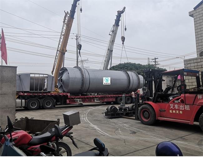 主要由供热源、上料机、进料机、回转滚筒、出料机、引风机、卸料器和配电柜构成;脱水后的湿物料从干燥机一端投入后,在内筒均布的抄板器翻动下,物料在干燥器内均匀分布与分散,并与并流(逆流)的热空气充分接触,加快了干燥传热,传质推动力。在干燥过程中,物料在带有倾斜度的抄板和热气流的作用下,可调控地运动至干燥机另一段星形卸料阀排出成品。