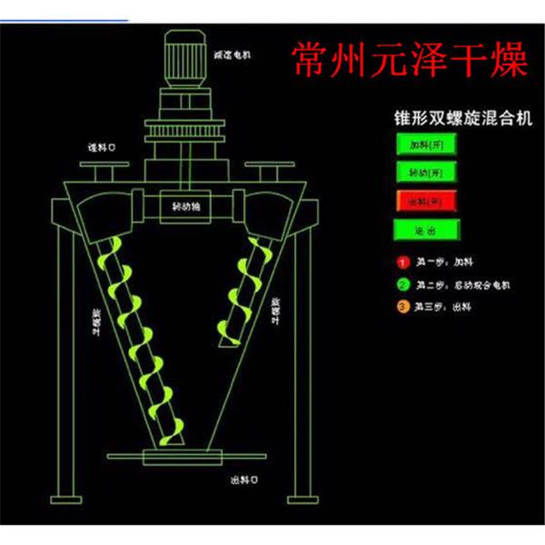 混合机筒体内两只非对称螺旋的快速自转将物料向上提升形成两股对称下向上的螺形物料流、转臂慢速公转运动,使螺旋外的物料,不同程度进入螺柱包络线内,一部分物料被错位提升,另一部分物料被抛止螺柱,从而达到全圆周方位物料的不断更新扩散,被提到上部的两股物料再向中心凹穴汇合,形成一股向下的物料流,补充了底部的空穴从而形成对流循环的三重混合效果