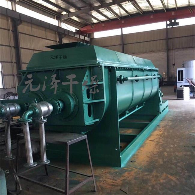 空心轴上密集排列着楔型中空桨叶,热介质经空心轴流经桨叶。单位有效容积内传热面积很大,热介质温度从-40℃到320℃,可以是水蒸汽,也可以是液体型:如热水、导热油等。间接传导加热,没有携带空气带走热量,热量均用来加热物料。热量损失仅为通过器体保温层向环境的散热。楔型桨叶传热面具有自清洁功能。物料颗粒与楔型面的相对运动产生洗刷作用,能够洗刷掉楔型面上附着物料,使运转中一直保持着清洁的传热面。桨叶干燥机的壳体为Ω型,壳体内一般安排二到四根空心搅拌轴。壳体有密封端盖与上盖,防止物料粉尘外泄而充分发挥作用。