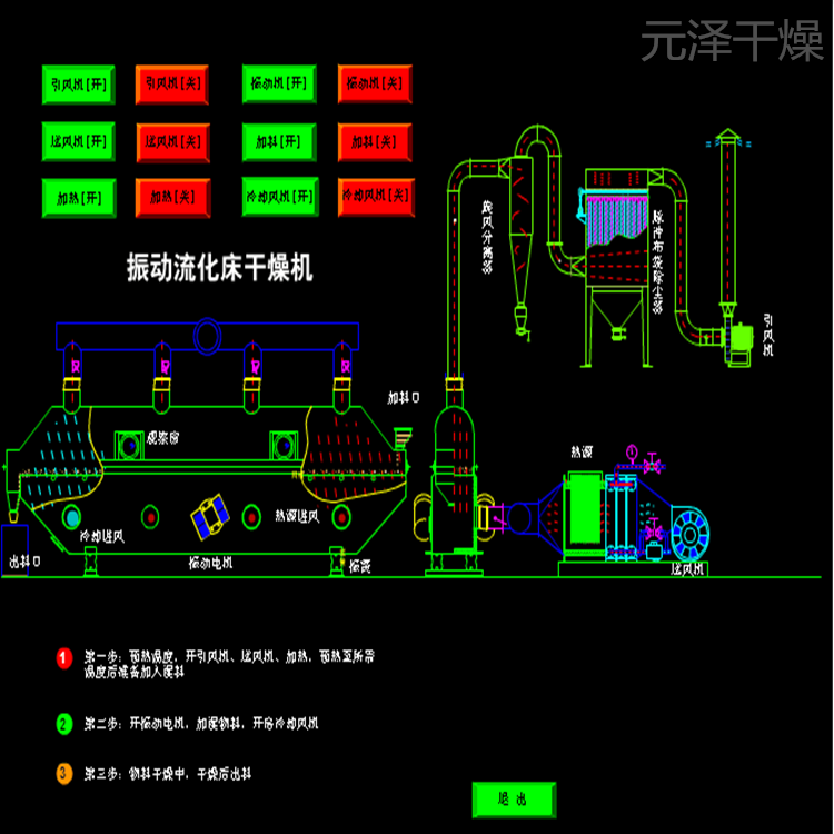 物料自进料口进入机内, 在振动力作用下, 物料沿水平方向抛掷向前连续运动,热风向上穿过流化床同湿料换热后, 湿空气经旋风分离器除尘后由排风口排出, 干燥物料由排料口排出。