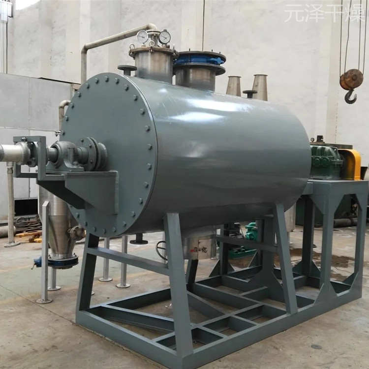真空耙式干燥机是一种新颖卧式间歇式真空干燥设备,湿物料经传导蒸发,带有刮板搅拌器不断清除热面上的物料,并在容器内推移形成循环流,水份蒸发后由真空泵抽出。本机采用大面积夹层加热方式,传热面大,热效率高,设置搅拌,使物料在筒内形成连续循环状态,进一步提高了物料受热的均匀度,从而可顺利进行浆状、膏状、糊状物料干燥。
